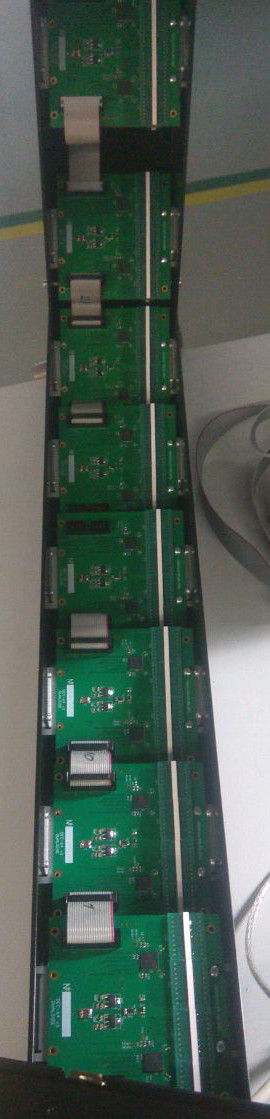 Вешаем всё это добро на плату, которая отвечает за сбор данных в пакетики и отправки их куда следует. Та в свою очередь склеит пиксели в строчку и выплюнет её на комп оператору, где в буфер ляжет очередной столбец изображения. А выплюнуть всё это тоже непросто - например в багажках формата 60х40см имеется 1280 пикселей. Каждый из них имеет изначально разрядность в 20 бит, но должен быть дополнен до вида, который воспринимается процессорами обычных ПК - 32 бита. Имеем 1000 "нарезок" в секунду. Итого нужно обеспечить среднюю пропускную способность в 32*1280*1000=40Мбит/с. Но это среднюю. На самом же деле окно для передачи одной строки строго ограничено и для такой же конфигурации багажки составляет всего 310мкс, что поднимает требования к мгновенной пропускной способности линии данных до 130Мбит/сек. Вы когда-нибудь пробовали ДЁШЕВО принять, обработать и пропихнуть такие объёмы информации в такой ограниченный срок? Вот и не пробуйте ) А то ещё подсядете на иглу FPGA и станете презирать процессоры )