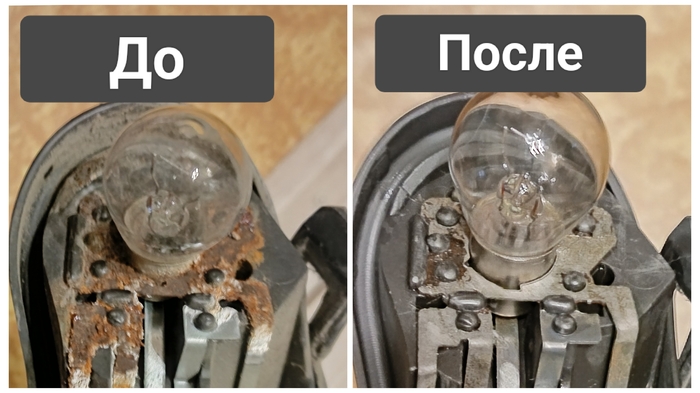 Лампа, которая находилась под напряжением долгое время во влажной среде окислилась и заржавела, пришлось отмывать лимонной кислотой. Она даже не выкручивалась оттуда.
