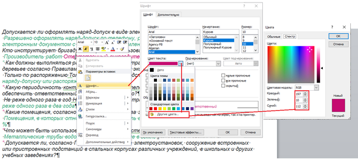Теперь необходимо убрать после каждого вопроса (черным цветом) двойной знак абзаца и оставить только 1 знак абзаца. Не нужно забывать про то, что черный цвет из источника был не совсем "Черным", в параметрах шрифта, выясняем его RGB палитру, в данном случае она: 33-37-41
