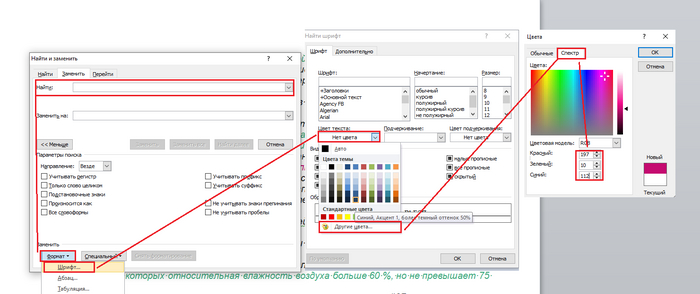 Дальше снова нужно перейти в заменить, указать формат того, что мы ищем, а именно шрифт по цвету и указать тот цвет, который был определен из предыдущего пункта: