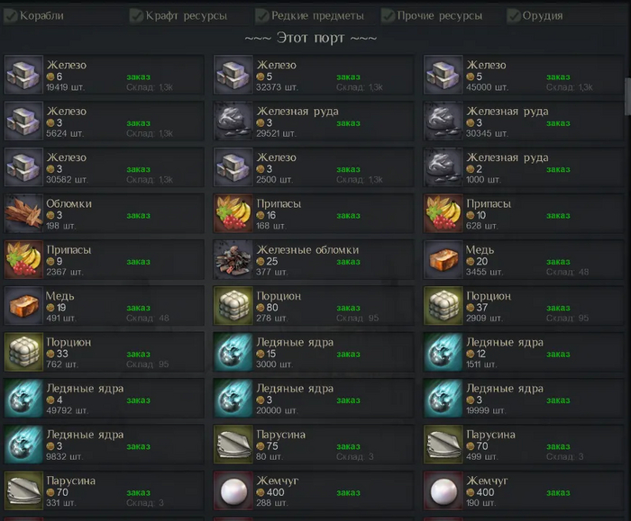 Тут так же есть и Биржа, где игроки выставляют заказы, что они хотят купить, и что хотят продать, в разных портах цена разная. Экономика тут живая. Туда-сюда ходят торговые суда с игроками и перевозят товары. Но как же их грабить?