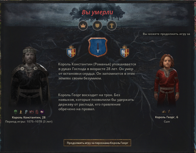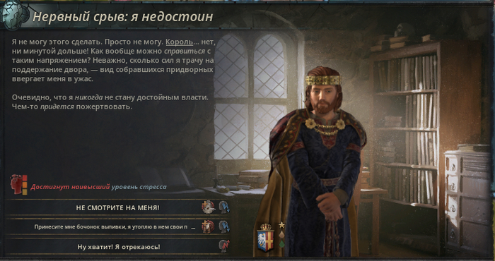 Однажды его Маршал намекнул королю о том, что рыцари малочисленны и стоит присмотреться к придворным, нельзя так сильно запускать армию. Константин видя своё неумелое управление снова словил нервный срыв.