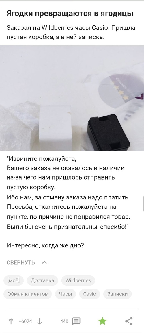 Собственно пользователь @rour62,решил создать пост, в котором ему пришла пустая коробка от часов с Wildeberries c запиской внутри от сотрудников.