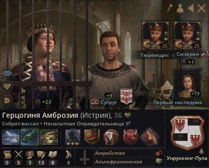 На приёме у императора, герцогиня Амброзия, учувствовавшая в заговоре против наследника, не совладала с выпивкой, она имела очень сильную страсть к спиртному и начала оскорблять наследника и императора. Для Бернардино II это стало последней каплей, долго сходил ей с рук блуд, который она устраивала в герцогстве, поэтому он заключил ее в тюрьму.