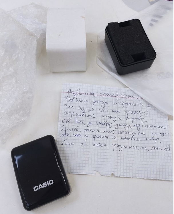 1)коробку от часов Casio, которая идет только вместе с часами, то есть часов там может не оказаться только в случае, если часы оттуда вытащили или украли. Если часов нет в наличии продавец не может отправить пустую коробку, потому что и коробки тогда от часов нет в наличии. Логично?