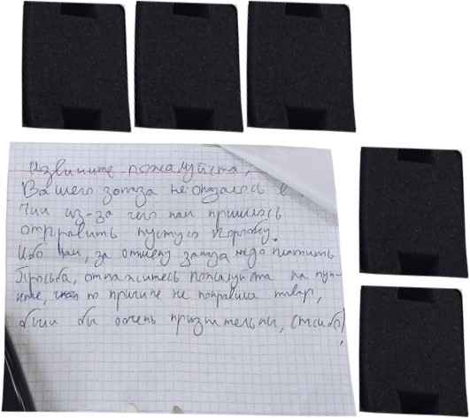 Извините вашего заказа не оказалось в наличии из-за чего нам пришлось отправить пустую коробку