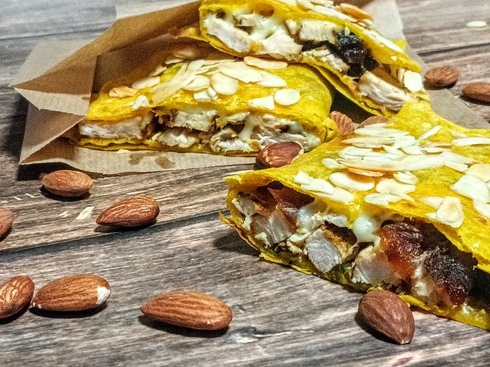 Очень простая кесадилья с пряной курицей в марокканском стиле и сушенными абрикосами. И еще добавим вкуснейший сливочный спред и грюер. Посыплем миндальными хлопьями и запечем в духовке до хрустящей корочки.