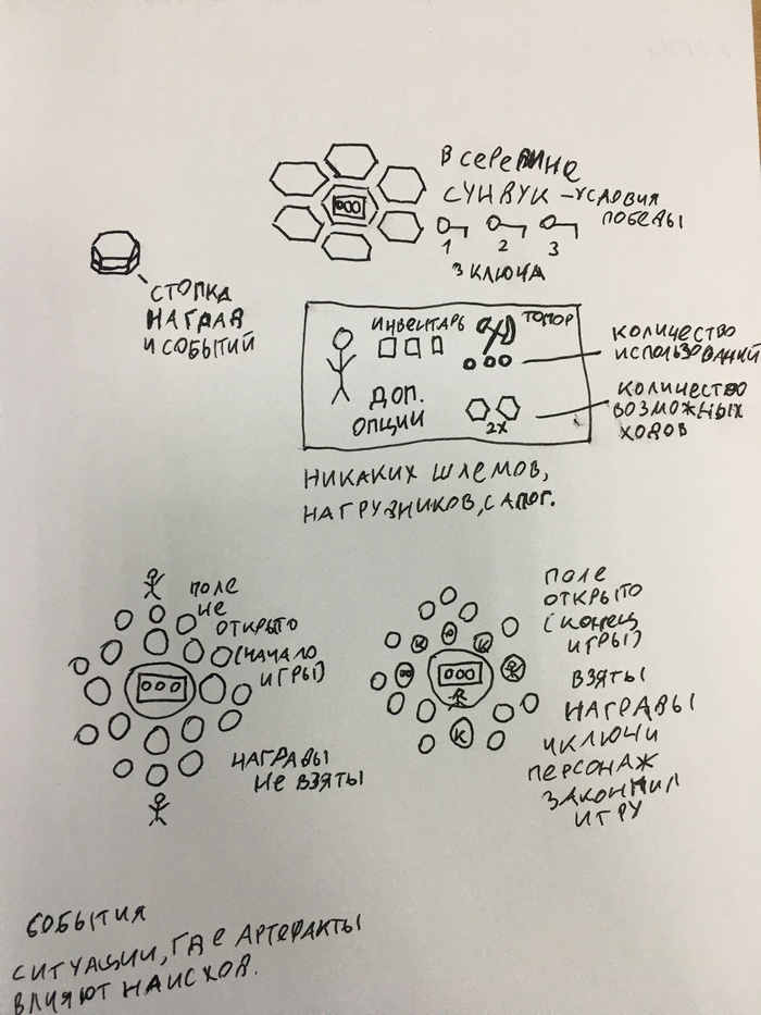Игрок двигается по полю с перевернутыми гексами. Вставая на гекс, он либо активирует событие, либо дерется с врагом, либо получает случайный артефакт, в зависимости от того, что скрывалось в гексе. Если он выжил после этого и последующих ходов, он ищет спрятанные ключи, пытаясь открыть как можно больше гексов, параллельно набирая инструментов в карточку персонажа для усложнения игры другому игроку. Конечная стадия - все гексы открыты, персонажи с точек на которых они остановились бегут с ключами в центр, естественно не все ключи будут доставлены, вариант потери ключей в битве с другим игроком я не исключаю.
