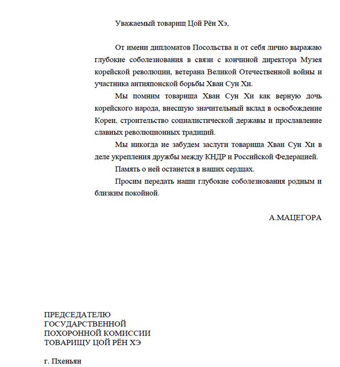 В мероприятии принял участие и посол России в КНДР Александр Мацегора, который "передал письмо с соболезнованиями председателю похоронной комиссии товарищу Цой Рён Хэ [глава президиума Верховного народного собрания] и вручил дочери покойной юбилейную медаль "75 лет Победы в Великой Отечественной войне 1941-1945 годов".