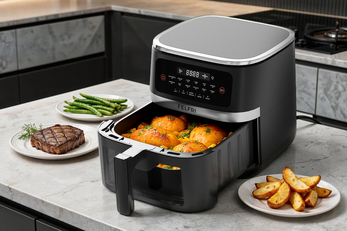 Пример такого формата — FELFRI FF-AF-05 на 6 литров. Мощность 2200 Вт, два ТЭНа, 12 программ. Надёжный вариант для повседневной кухни без экспериментов.