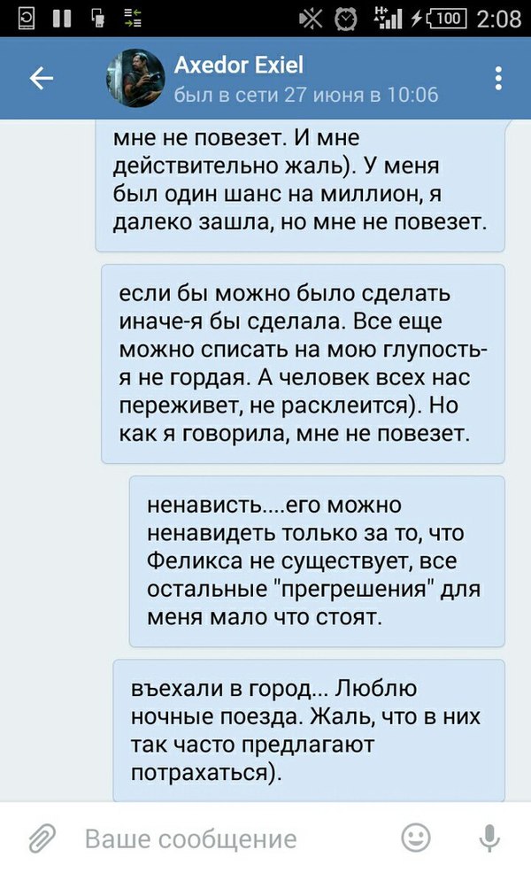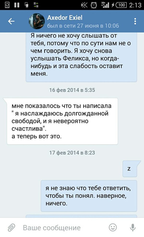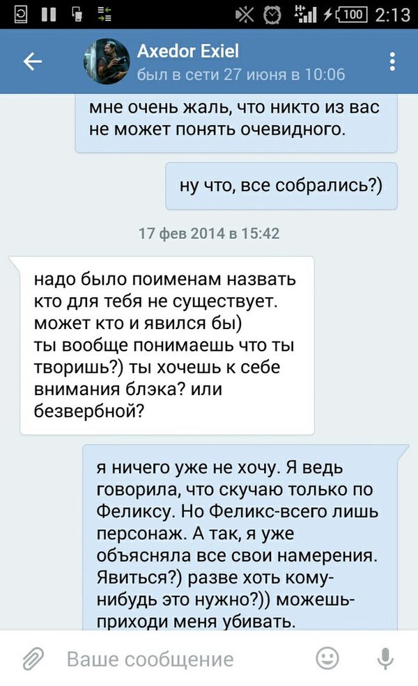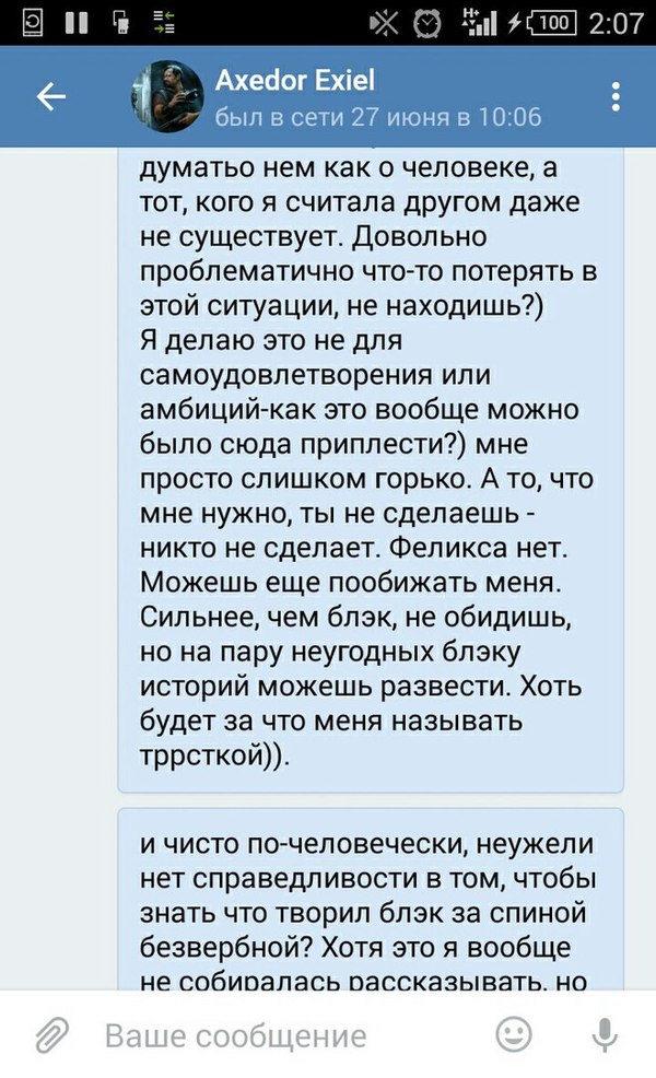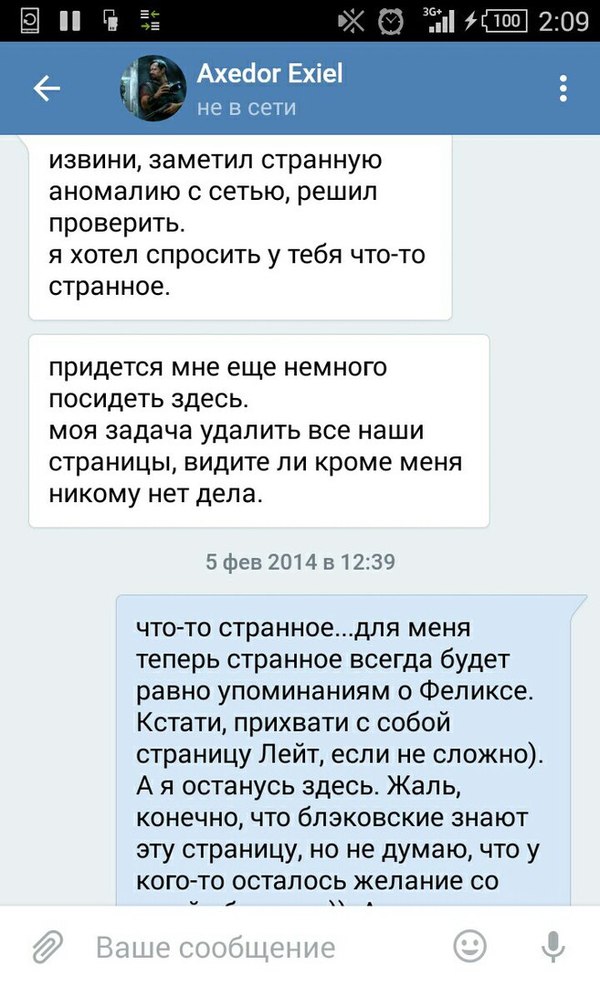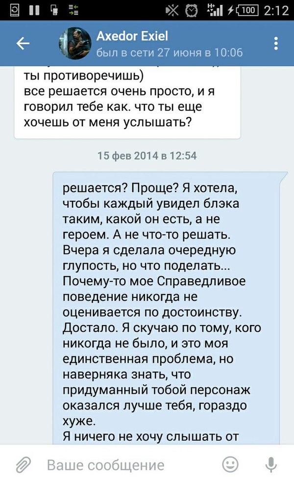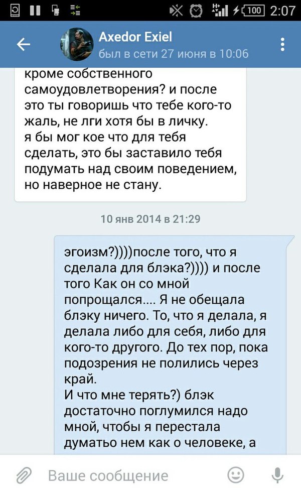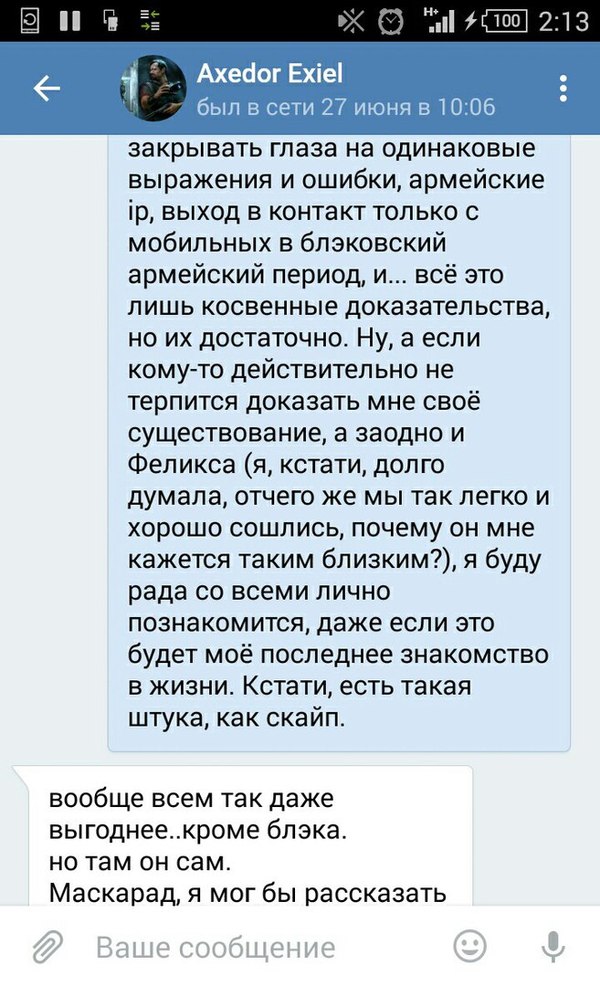 К тому времени как Блэк откинулся из армии Феликс решил исчезнуть, мол, нечего тут ловить. Я по своей дурости подумала, что всё закончено, и раз Блэк продолжает со мной общаться и так поносить свою недождавшуюся девушку, то, может, он рассчитывает на продолжение отношений. Но нет, он возвращается и всё идёт как прежде. Мы по-прежнему болтаем в интернете, он по-прежнему встречается с девушкой, которая его не дождалась. Наконец, он просит встречи. К моменту той встречи у меня уже не было никакого желания ни продолжать отношения, ни просто общаться с этим человеком, только желание расставить все точки над и. Пожалуй, итог той встречи можно представить финальной перепиской с Акседором, что я и сделаю.