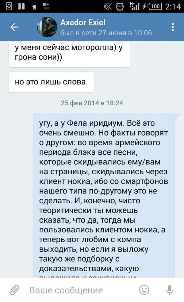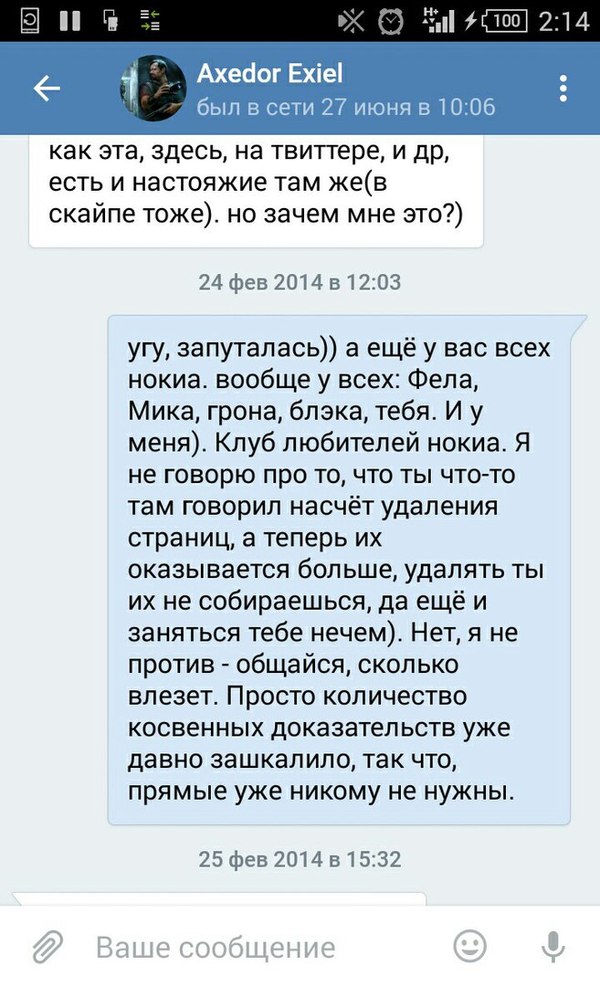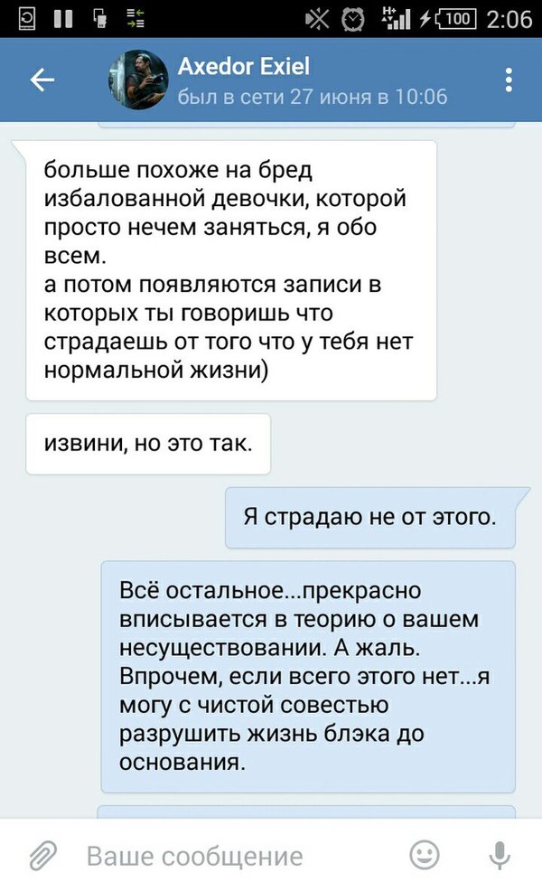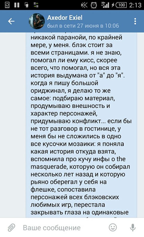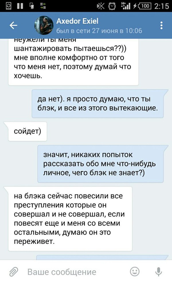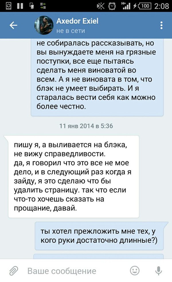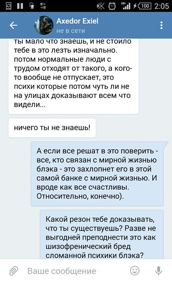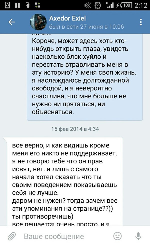 К тому времени как Блэк откинулся из армии Феликс решил исчезнуть, мол, нечего тут ловить. Я по своей дурости подумала, что всё закончено, и раз Блэк продолжает со мной общаться и так поносить свою недождавшуюся девушку, то, может, он рассчитывает на продолжение отношений. Но нет, он возвращается и всё идёт как прежде. Мы по-прежнему болтаем в интернете, он по-прежнему встречается с девушкой, которая его не дождалась. Наконец, он просит встречи. К моменту той встречи у меня уже не было никакого желания ни продолжать отношения, ни просто общаться с этим человеком, только желание расставить все точки над и. Пожалуй, итог той встречи можно представить финальной перепиской с Акседором, что я и сделаю.
