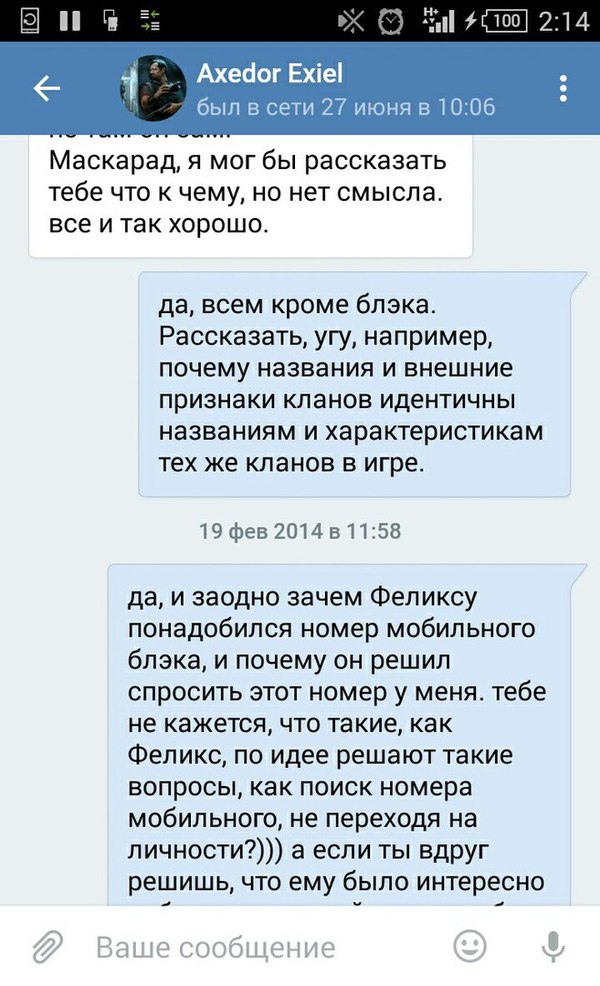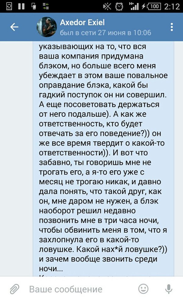 После этой истории активизировался Феликс и сказал, что из-за моего поведения он Блэка наказывает ссылкой. Что, куда - не моего ума дело. Сам Блэк по этому поводу ничего не говорил. И действительно, где-то в мае он исчез. На его стене в вк стали появляться жалобные записи о том как же ему "там" плохо и что это "там" явно филиал ада на земле. Я обратилась к его друзьям с вопросом куда же он делся. Все друзья сказали мне, что он в армии, некоторые даже адрес давали. Но я не верила. Как же так, ведь он сам сказал, что не знает куда его отправляют, а Феликс и вовсе сказал, что это ссылка. Что мне какие-то там друзья, есть же Феликс, мой лучший друг, которому я доверяю свои страницы и которому рассказываю все свои печали. А тут и его девушка начала писать про какую-то армию. Сомнения закрались мне в голову и я решила с ней поговорить. Мы встретились, я показала ей смс от Блэка, наши переписки, рассказала всё то, что происходило со мной, Блэком и всеми участвующими. Никаких криков "о, нет, он мне изменял" или чего-то подобного не было. Её не убедили ни смс, ни переписки, правда, она тоже сказала, что он в армии. И на этом всё.