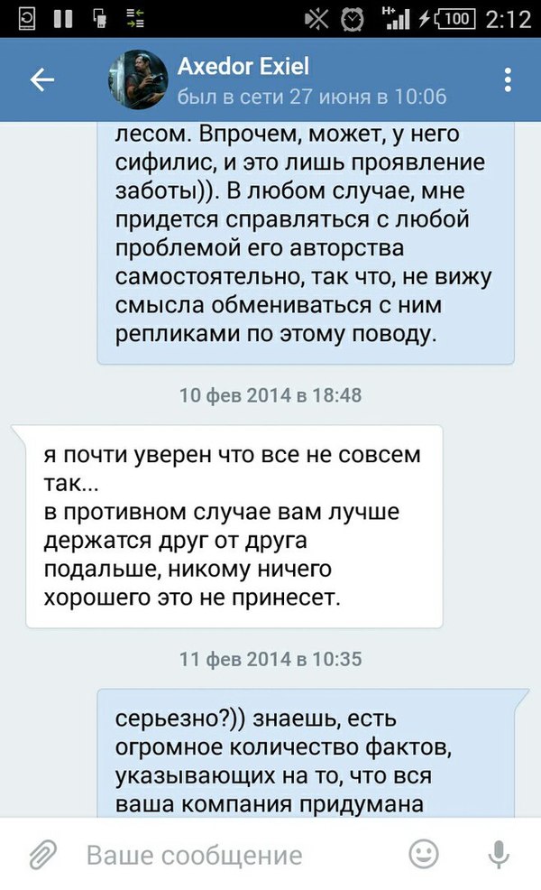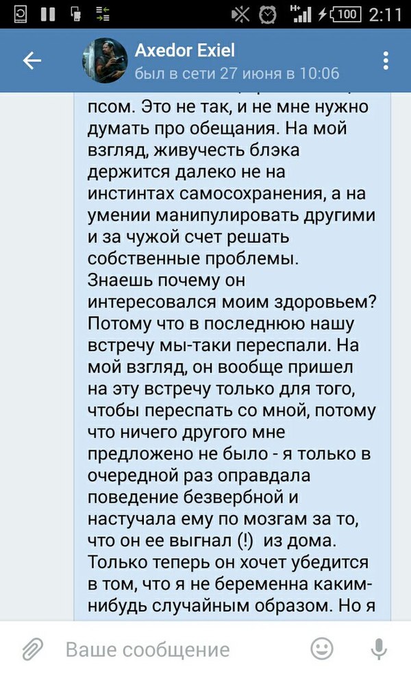 С Блэком всё стало совсем плохо и мы расстались под тем соусом, что я не могу владеть Блэком и использовать его, поэтому он уходит к Феликсу. Правда, под шумок оказалось, что он уже давно встречается с другой девушкой, но это, разумеется, несерьёзно, а только потому что ему нужно трахаться, да и генетически она ему подходит, а ещё она биотехник и вообще во всём лучше тебя! Потом оказалось, что биотехник значит еле успевающая студентка медвуза, ну, подумаешь, преувеличил. Т.к. Блэк ушёл к Феликсу, началась промывка мозгов - в прямом смысле, чтобы сделать из него такого же рационального неподверженного простым человеческим слабостям суперсолдата, каким был Феликс. Под воздействием биостимуляторов, которые принимались под надзором одного из Феловских - Мика (https://vk.com/shadow_cross), Блэк начинает терять память и делать вид, что не помнит меня. Совсем. Хотя прекрасно помнит всех вампиров и свою новую девушку. С которой уже всё гораздо серьёзнее. И всё равно продолжает со мной общаться, хотя Феликс ему строго-настрого запретил, ай-яй-яй. Правда теперь мы общаемся не в вк, активность Блэка в котором контролирует Фел, а в фэйсбуке, аське и даже всети (была такая соц.сеть в РБ). Я пыталась рассказывать Блэку о том, что между нами было (пиздец дура), перекидывать ему наши старые переписки. Примерно тогда я стала сохранять все переписки с этими персонажами, ибо и Блэк, и все остальные стали просить меня их удалять. Иногда они взламывали мои страницы и удаляли переписки оттуда сами, поэтому во избежание потери контроля над страницами я отдала пароли Феликсу, а переписки всё равно продолжила сохранять. Так или иначе, к Блэку я всё равно испытывала большие и чистые чувства. Я всё ещё надеялась на то, что он ко мне вернётся, ведь он же так интересуется тем, что между нами было, и девушка его совсем не оправдывает его ожиданий. Так я упросила его на личную встречу, на которой мы переспали. Он себя за это очень сильно корил, мол, этим он подвёл Феликса. А у меня случилась задержка. И тест положительный. И гинеколог мне сказала, что я беременна. Я записалась на узи и позвонила Блэку. Тот сначала в отказ, мол, такого не может быть, потом говорит делать аборт, в конце концов он сказал, что лично приедет и посмотрит на результаты теста. Приехал он лично с другом, я с этого охуела, и прям на вокзале сказал мне идти и сделать тест. На волне этого охуения я пошла и сделала его - положительный. А он всё равно в отказ - никакой он мол, не положительный, вот эта маленькая полоска не считается. Наверное, в этот момент вся моя любовь улетучилась. Но я проводила его на поезд, на следующий день пошла в платную клинику делать узи и прямо там у меня пошли месячные. Врач признаков беременности не увидел. Гинеколог, к которой я пришла с результатами, сказала, что бывает ложноположительный, хоть и редко.