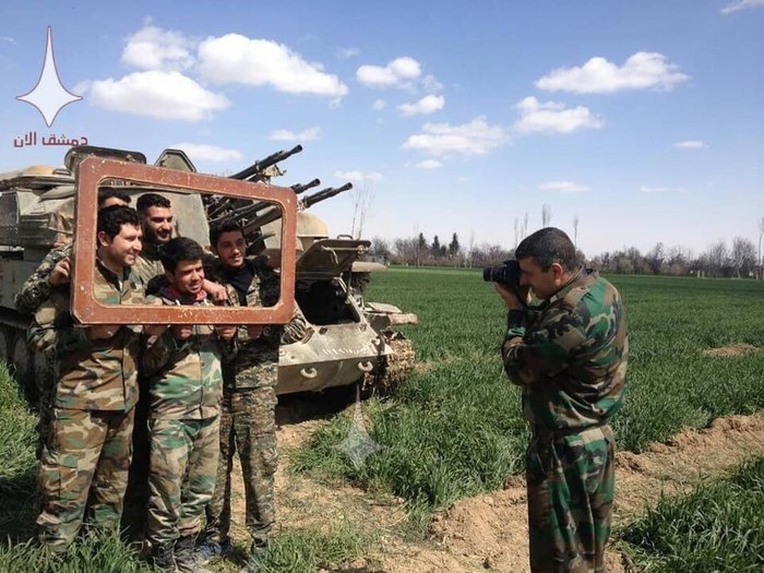 Генерал САА Сухель аль Хасан на позициях в восточной Гуте под присмотром военнослужащих СпН РФ