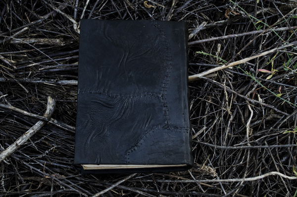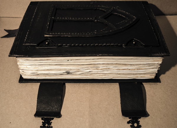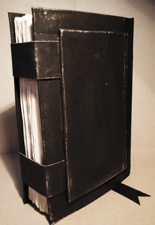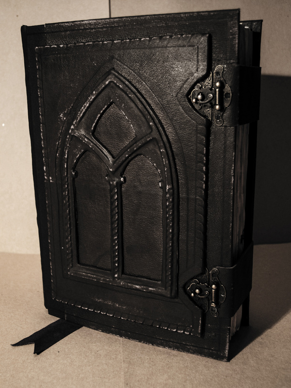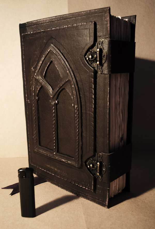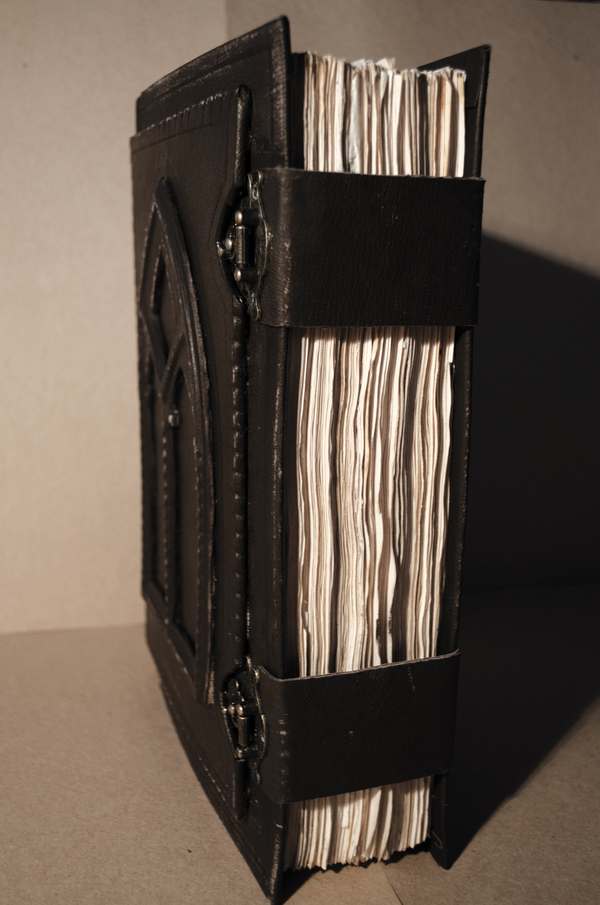 Кстати обложка из натуральной кожи . Центр я увенчал окном в готическом стиле , а обрез -двумя ремешками с металлическими застежками , впрочем это итак видно )
