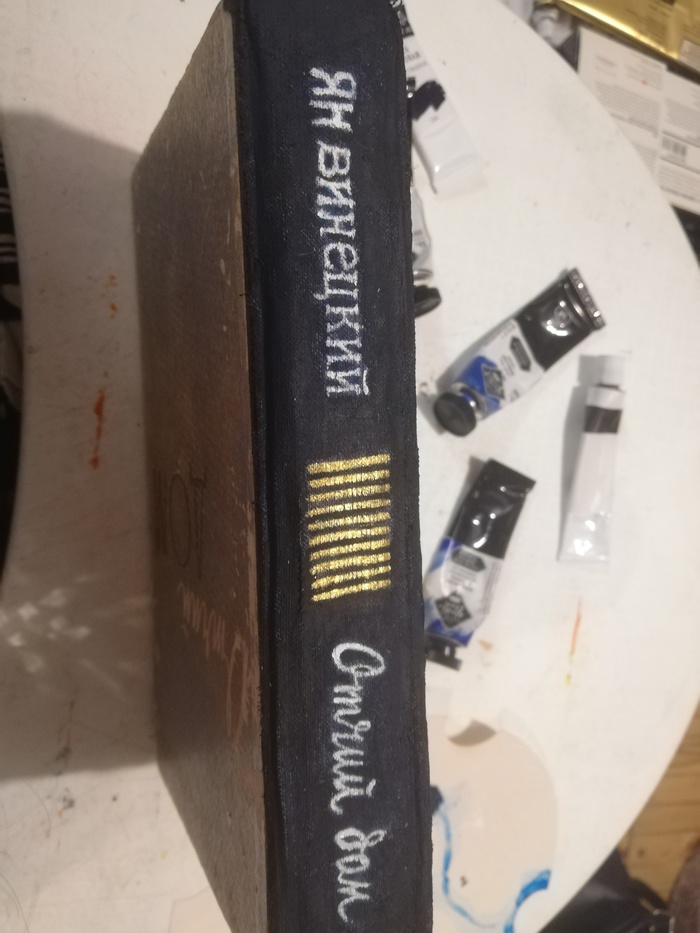 Что ж, грустно, конечно, но вернуть назад хрупкий слой я уже не в силах, будет мне наука. Начинаем подкрашивать корешок акрилом.