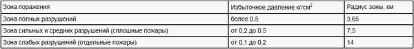 Пошарив в интернете нашел статью с расчетами и прочей мутью. Ниже приведена табличка "Радиусы поражения для воздушного взрыва бомбы эквивалентом 1 МТ".