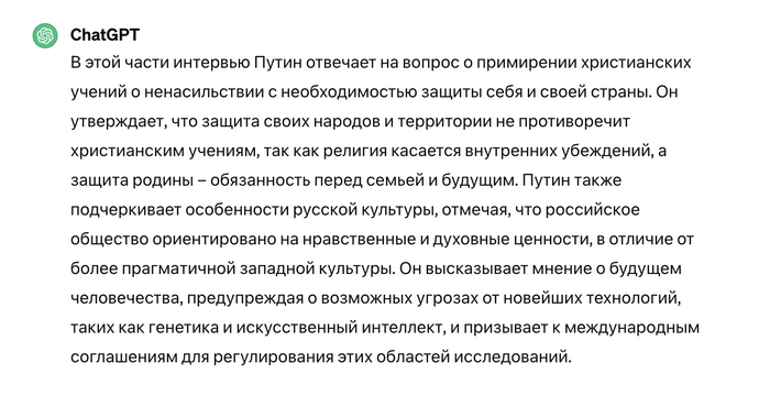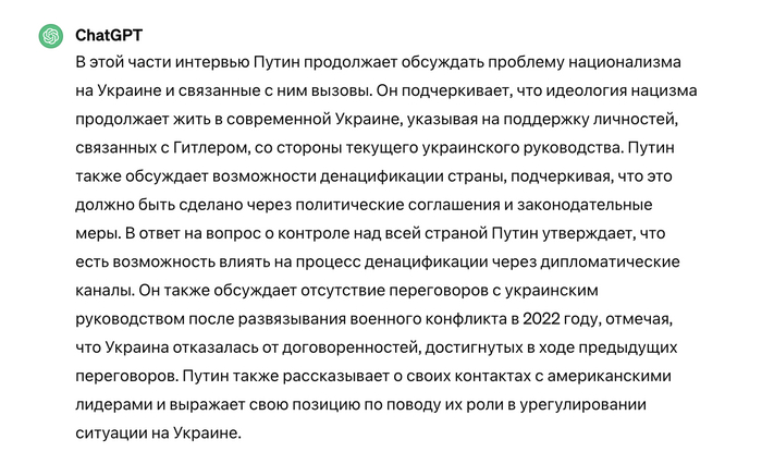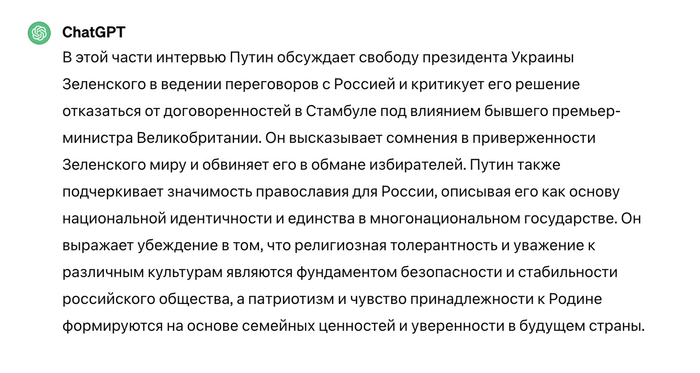 Если Вы тоже не любили Войну и Мир ⚔️💥🪖🛡️, а в школе читали только краткое изложение, то просмотреть все 2 часа интервью было довольно не просто. Но слава роботам – теперь у нас есть ChatGPT, который неплохо умеет сокращать длиннотексты сохраняя их смысл.