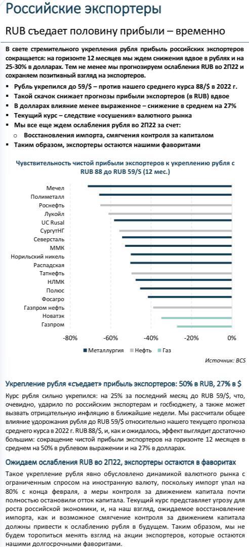 Рубль укрепился на 25% за последний месяц, что, ударило по российским экспортерам и бюджету. BCS рассчитали общее влияние удорожания рубля до RUB 59/$ относительно их прогноза среднего курса в 2022 г. RUB 88/$. Эффект выглядит серьезным: сокращение прибыли экспортеров (12 мес.) в среднем на 50% в рублях и на 27% в долларах.