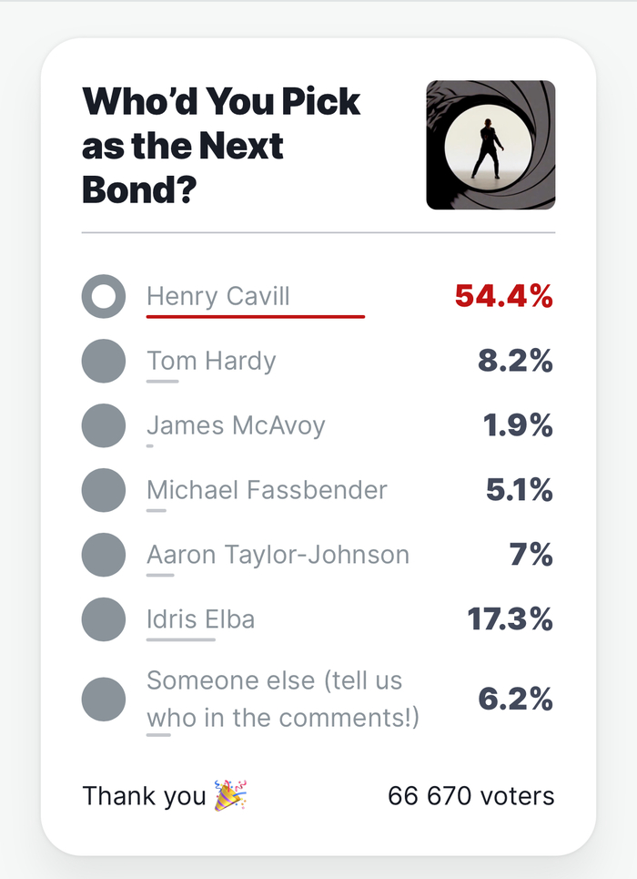 Некоторые называют Тома Харди, Идриса Эльбу, Джеймса МакЭвоя, Майкла Фассбендера и Аарона Тейлора-Джонсона. Но явным фаворитом фанатов является Генри Кавилл.