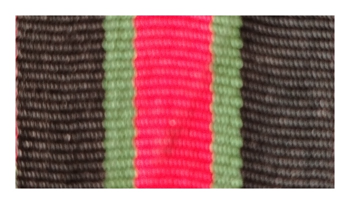 Медаль при помощи ушка и кольца соединяется с пятиугольной колодкой, обтянутой шелковой муаровой лентой серого цвета, окаймленной по краям черными полосками шириной 2 мм.