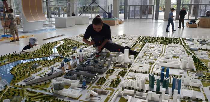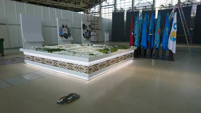 В июне 2018 г. наша команда занималась созданием выставки, посвященной 20-летию г. Астана, проходившей на ВДНХ в г. Москва. Ключевое место в экспозиции занял макет г. Астана.