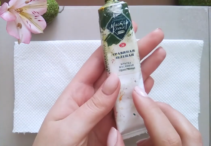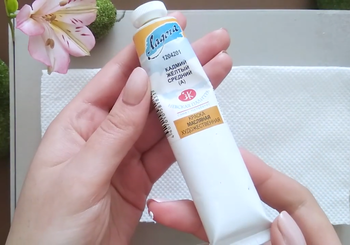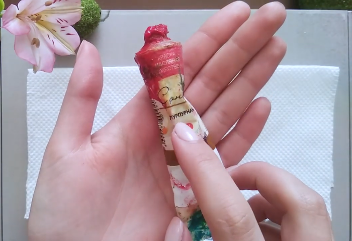 В этот момент окрашиваем мы маслом, очень тонким слоем. По верхнему краю алым, далее капельку зелёного и кончик делаем жёлтым. После этого можно придавать форму