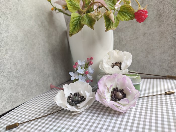 Цветы сделаны из холодного фарфора, это такой вид полимерной глины, массы для лепки ( называйте как удобно) которая застывает на воздухе в течении 24 часов. Далее я покрывают цветы сатиновым лаком, чтобы меньше пачкались и дольше служили.