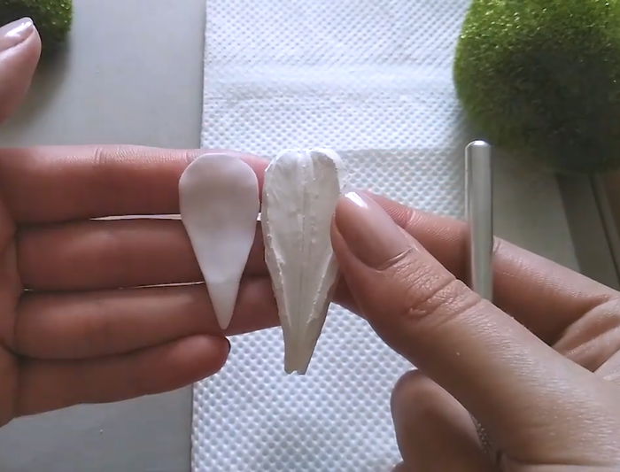 Из шарика глины катаем каплю. И уже из неё будем раскатывать лепесток. Он должен быть немного меньше чем силиконовая форма (вайнер) когда он будет внутри и мы надавим на форму, то он соответственно немного увеличится и станет как раз.