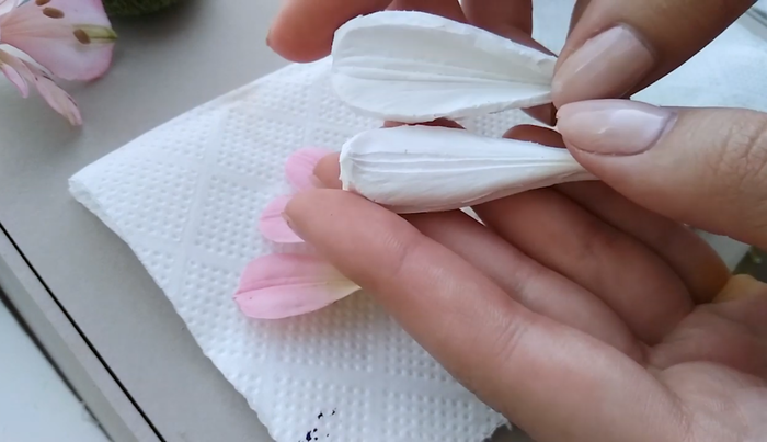 Далее, прежде чем сделать оттиск нужно придать оттенок будущему лепестку, пока на нём нет рельефа проще равномерно окрасить.