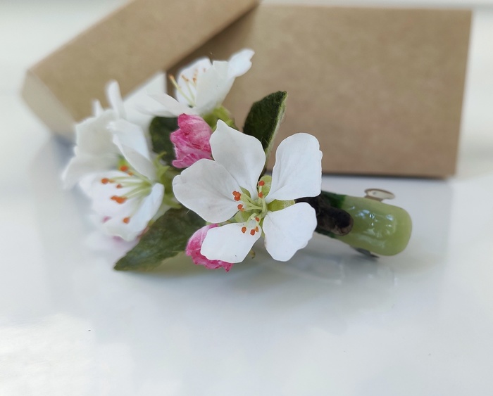 Саму веточку, как видно на фото, я тоже крепила эпоксидкой. Во первых это надёжно, а во вторых мне нравится как это выглядит, буд то веточку положили на влажную поверхность. Плюс нет никаких проволочек и дополнительных креплений которые могут бросаться в глаза. Краешки основы тоже залиты смолой таким образом человеку не страшно будет застёгивать заколку. Ведь краешек выглядит стеклянным, прочным и там нет цветов. Туда я вывела край веточки) Возможно будут ещё вопросы по поводу заколки, пишите, я с удовольствием пообщаюсь. А так же, я планирую сделать мастер класс по лепке цветов яблони. Так что если вам это интересно то присоединяйтесь к обсуждениям)