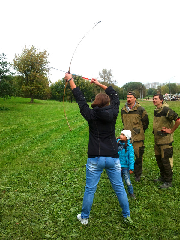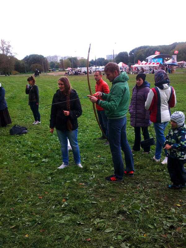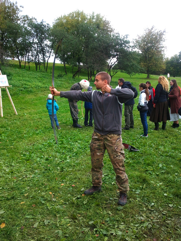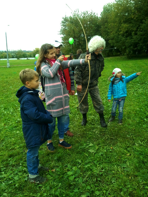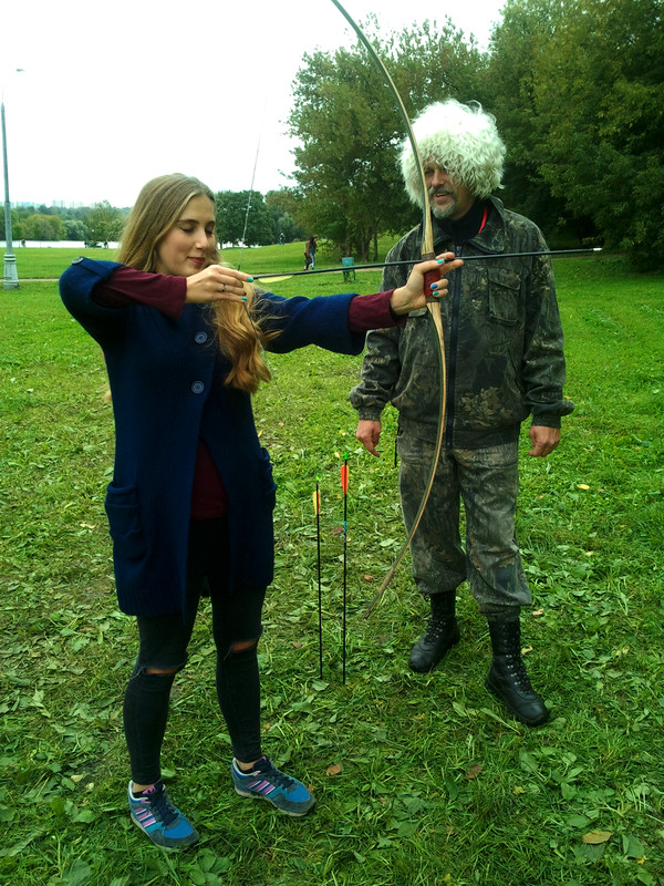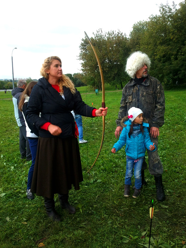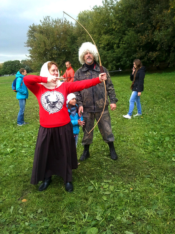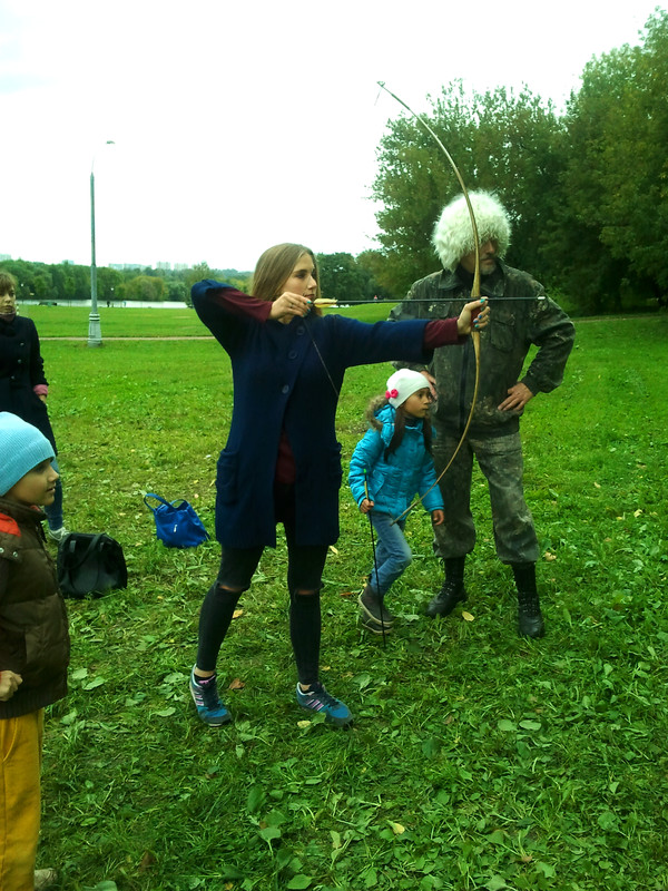 На этих выходных меня случайно занесло в московский парк Коломенское, где проходил фестиваль "Православие и спорт". Среди ряда развлекательно-спортивных мероприятий была стрельба из лука, попробовать силы в которой (без-воз-мез-дно, то есть даром) всем желающим предлагали казаки-реконструкторы и их очаровательная ассистентка.