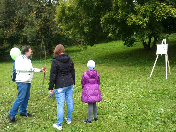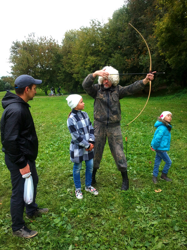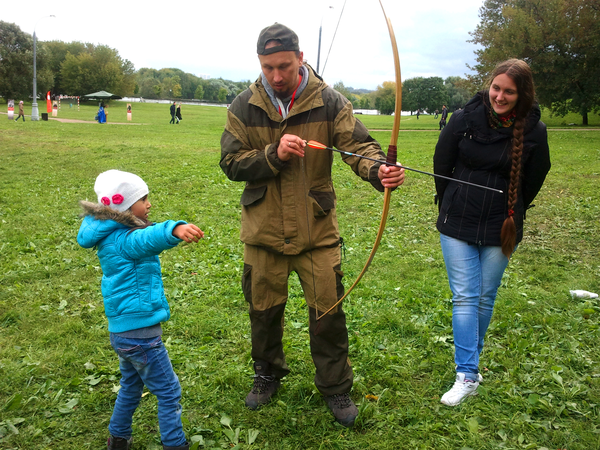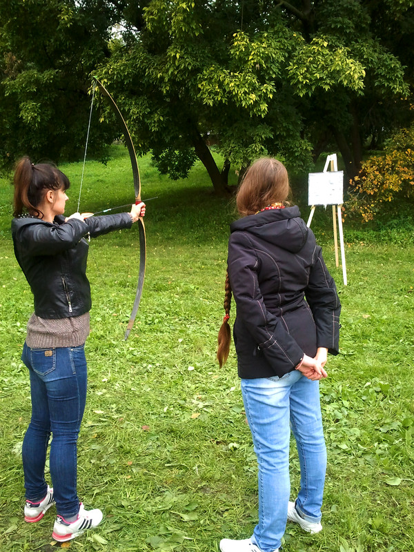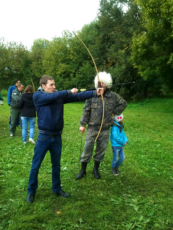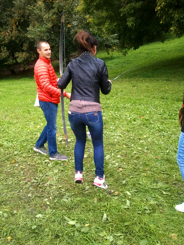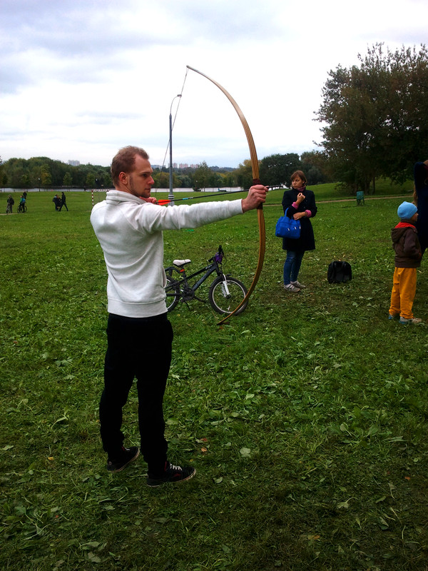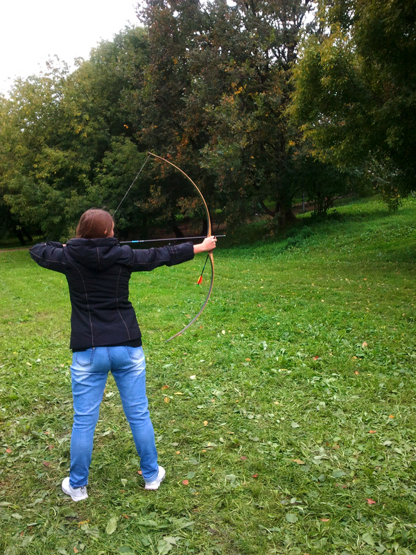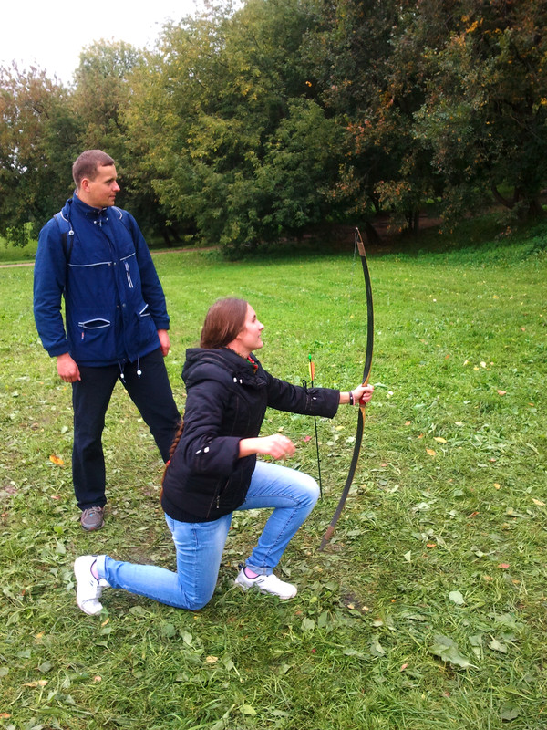 На этих выходных меня случайно занесло в московский парк Коломенское, где проходил фестиваль "Православие и спорт". Среди ряда развлекательно-спортивных мероприятий была стрельба из лука, попробовать силы в которой (без-воз-мез-дно, то есть даром) всем желающим предлагали казаки-реконструкторы и их очаровательная ассистентка.