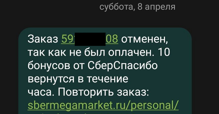 "Заказ N**** отменён, так как не был оплачен. 10 бонусов СберСпасибо вернутся в течении часа. Повторить заказ: [ссылка]"