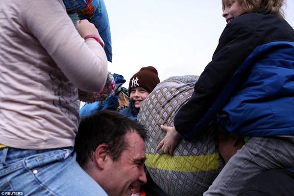 Те, кто уже не в первый раз принимает участие в подобной затее, подготовились должным образом, не забыв одеть защитные маски и очки, ведь пух и перья летали повсюду, превратив поле битвы в сплошной белый ковёр.