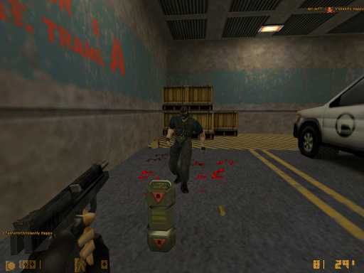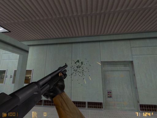 На мой взгляд, очень реалистичная и вообще приятная фича. Кстати, в CS beta 1.0 оружие оставляет следы на предметах при каждом выстреле, а не через один, как в Half-Life. Если же пуля попала не в стену, а в игрока, то это событие сопровождается всплеском спрайтовой "крови"