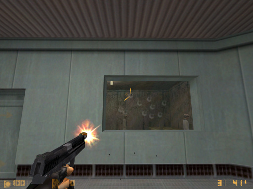 Темп стрельбы при этом вдвое ниже, чем у берста из CS1.6, а выпустить следующую очередь можно лишь после небольшой паузы. Оружие не отличается особой мощностью, но с близкого расстояния одной очереди хватает, чтобы убить противника, не имеющего бронежилета. Это при условии, что все пули попадут в корпус, либо хотя бы одна придется в голову. Точность стрельбы тоже невысока. Уже на средней дистанции разброс пуль таков, что они не укладываются в силуэт модели игрока. Однако, в отличие от поздних версий, где пули из глока рассеиваются преимущественно случайным образом, в CS beta 1.0 их разброс имеет довольно-таки постоянный характер. Т.е., одна пуля идет примерно в точку прицеливания, две другие отклоняются вертикально вверх почти на одинаковую величину. На скриншоте ниже показан результат отстрела одного магазина. На данной дистанции получилось ничего так: