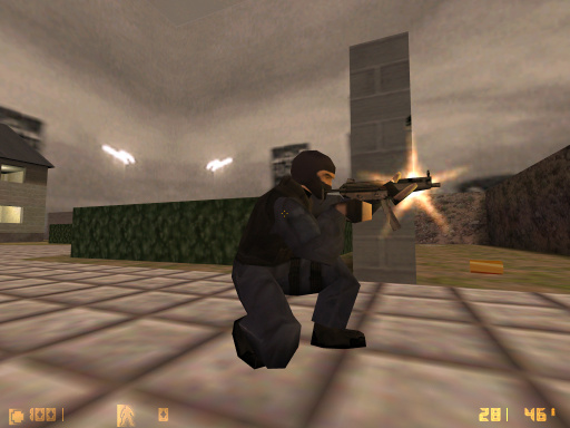 Если внимательно присмотреться, можно заметить, что гильзы вылетают примерно из той точки, куда "привязан" при создании модели эффект вспышки. Дело в том, что у моделей оружия из CS beta 1.0 нет отдельного attachment'a для "привязки" эффекта выбрасываемых гильз. В качеcтве самих гильз использованы стандартные модели Half-Life. Для дробовика это модель shotgunshell.mdl, для всего остального вооружения - shell.mdl. Ну, и как в HL, автоматическое оружие, не считая Glock, выбрасывает гильзы только после каждого второго выстрела. Кроме того, в CS beta 1.0 гильза дробовика падает на пол со звуком падения пистолетной гильзы из ХЛ (что пофиксили только в CS1.6, да и то не сразу), а вот собственно пистолетные и прочие гильзы вообще не издают при падении никакого звука. Может потому, что растворяются в воздухе, обычно не успевая долететь до пола.