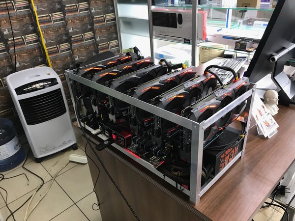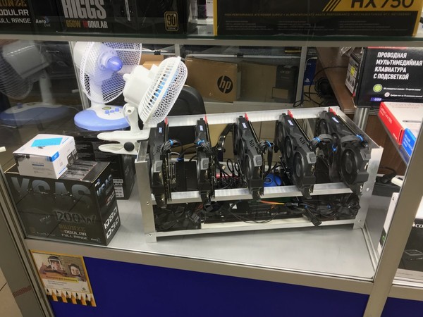 Во втором посещённом мной магазине прямо на витрине стоит самодельная стойка под пять чипов от MSI. Ферма уже подключена к пулу компьютеров, добывающих криптовалюту: компьютер подключён к интернету через LTE-донгл, подключаемый по USB. Горячий воздух от видеокарт сдувается в сторону китайским вентилятором: в помещении довольно жарко.