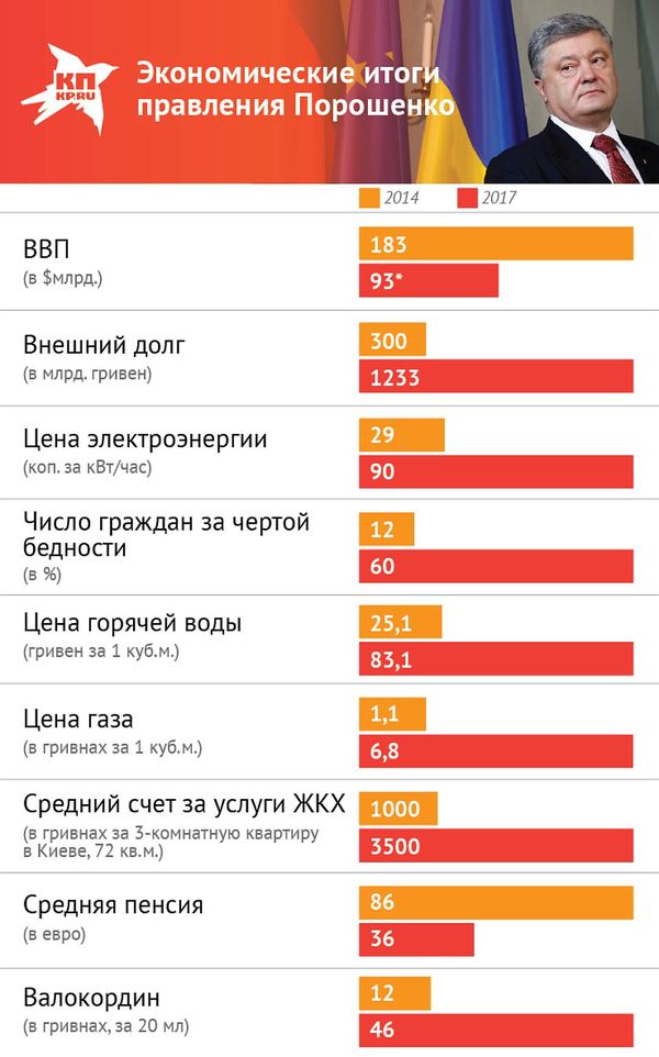 В остальном же «украинского рая» не вышло. И вряд ли в оставшийся год президентства Порошенко выйдет — украинские товары пускают в Европу неохотно (зачем ЕС лишний конкурент?), экономика летит в тартарары, заводы останавливаются, услуги ЖКХ подорожали за 3 года в 7 (!) раз, война в Донбассе продолжается, нацизм фактически узаконен, русофобия стала госидеологией, связи с Россией разрушены. Разочаровавшийся в идеалах Майдана народ разъезжается. Украина уже официально признана беднейшей страной Европы. И самой коррумпированной!