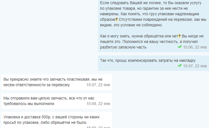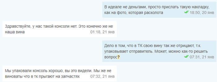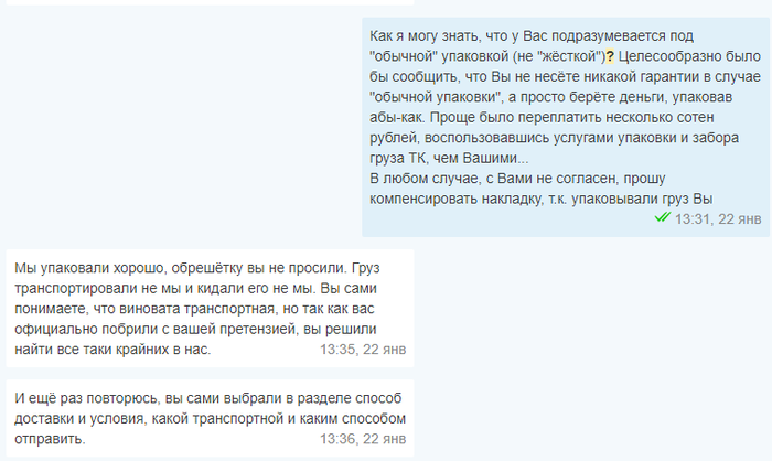 Далее пошли "качели" - я пытался им доказать, что они оказали услугу по упаковке, продавец пытался доказать, что с его стороны я ни на какую компенсацию рассчитывать не могу. Решаю в таком случае написать администрации сайта @Dromru