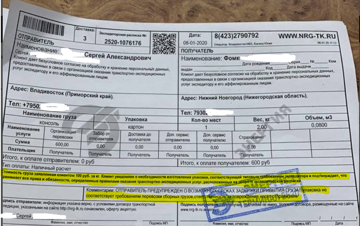 2. Упаковка не соответствует требованиям перевозки сборных грузов. Ответственность за повреждения несёт отправитель.