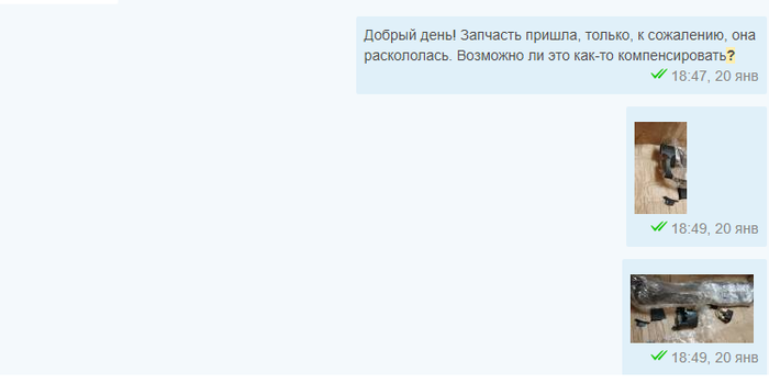 20.01 забираю запчасть с терминала. Выдача груза устроена таким образом, что пока не подпишешь накладную, что претензий не имеешь и не произведёшь оплату - груз не получишь. Ооок, продолжаем смотреть на мир через розовые очки. Что может пойти не так? Довольный забираю запчасть, прыгаю с ней в такси и еду домой. Раскрываю дома упаковку. И что же я там вижу? Правильно, разбитую накладку:
