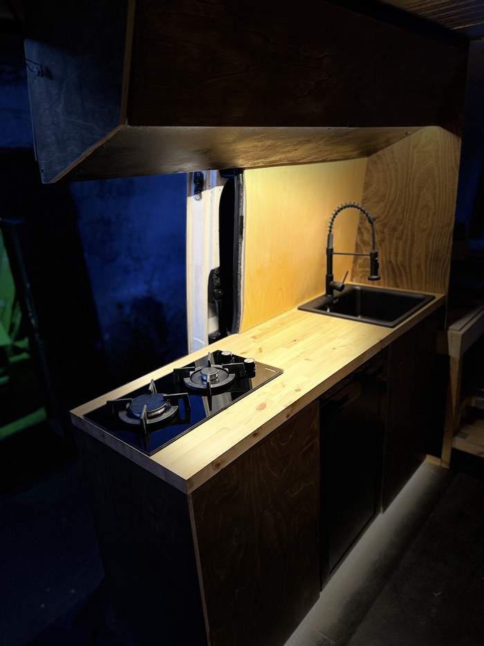 Сразу же накинул диодную ленту дабы понять как это будет красиво. Ну и осталось подумать над «фартуком» и над дном подвесных ящиков, а именно цвет. В планах 4 мм фанера покрытая прозрачным лаком, потому что все итак очень темное в итак ограниченном пространстве, это вскоре может угнетать.