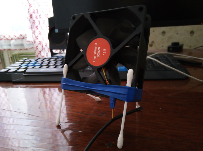 Нам понадобиться копеечный вентилятор от пк, 4 ватные палочки, синяя изолента и какой нибудь блок питания, я использовал старый зарядник.