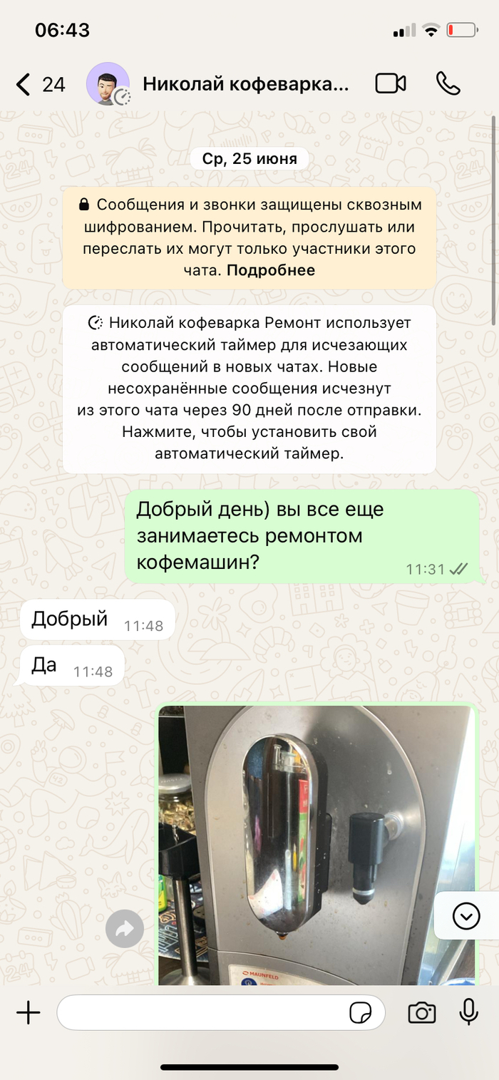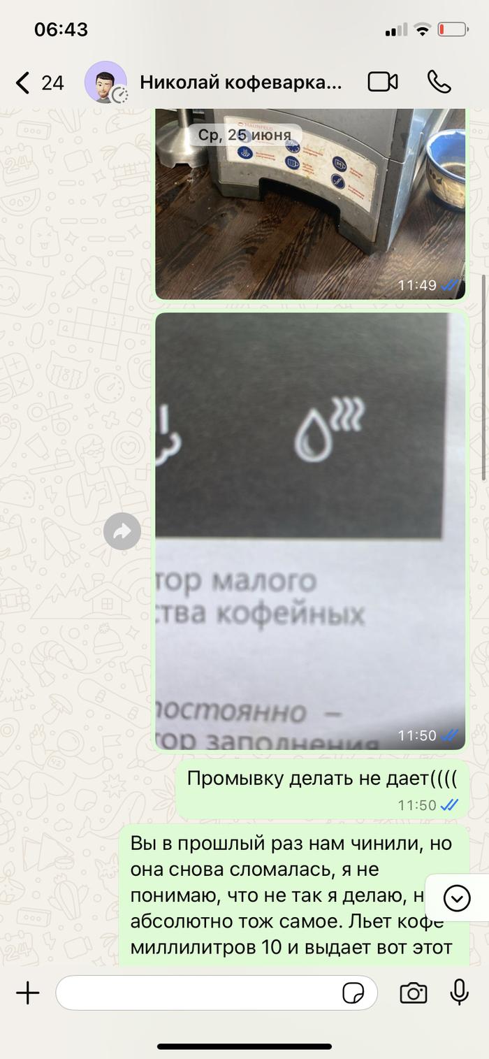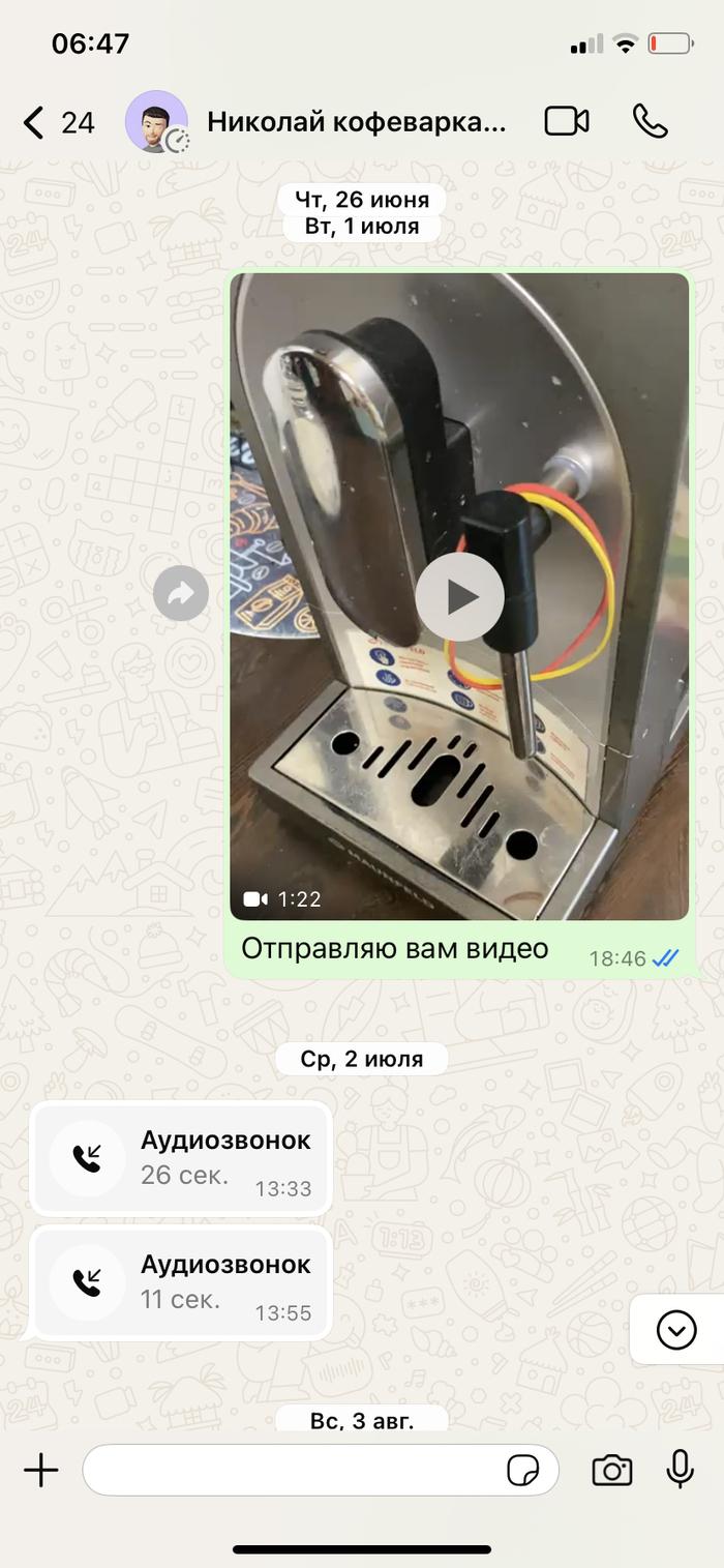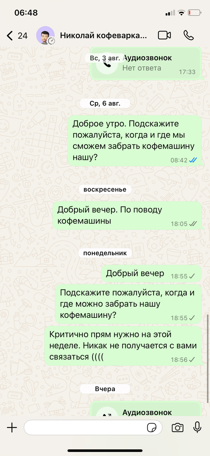 Добрый день, прекрасно понимаю, как это выглядит со стороны. Заранее согласна, сама себе дура… Итак ситуация. Сломалась кофемашина - позвонила на горячую линию, указанную в инструкции, мне дали номера телефона сервисов в городе, позвонила, ужаснулась, как далеко придется ее везти, взяла паузу, чтоб прикинуть логистику. Через какое-то время мне перезвонили- говорят мастер может приехать. Я радостно соглашаюсь. Все прошло отлично, починил за 2 дня, сам привез обратно, ценник вполне божеский. Сказка же!!!! Поэтому при поломке через год обратилась повторно. И вот тут начался цирк с конями… все по той же схеме - мастер приехал, забрал… и пропал с радаров…. Ждем неделю… две… три… периодически звоню, отвечает крайне редко и неохотно, то его в городе нету, то кофемашина у коллеги, то еще какая оказия… на данный момент прошло уже полтора месяца, последний раз дозвонилась до него 8 августа, попросил написать в выходные… написала и тишина. Я не знаю что делать, никаких бумаг нету((( только переписка в ватсап, ну как переписка…. Тихо сам с собой я веду беседу…адреса сервиса не знаю. По номеру телефона бьется один адрес, он, при последнем разговоре, упоминал территориально совсем другую локацию. Подскажите, товарищи, как мне быть в такой ситуации? Я понимаю прекрасно, что сам себе злобный Буратино, но очень хочется вернуть кофемашину(((( из пруфов только скрины переписки с этим Николаем….теги ставить не умею, ибо в основном читаю. Буду благодарна любому полезному совету!!!!