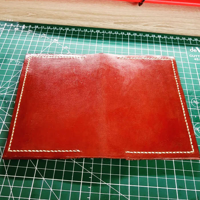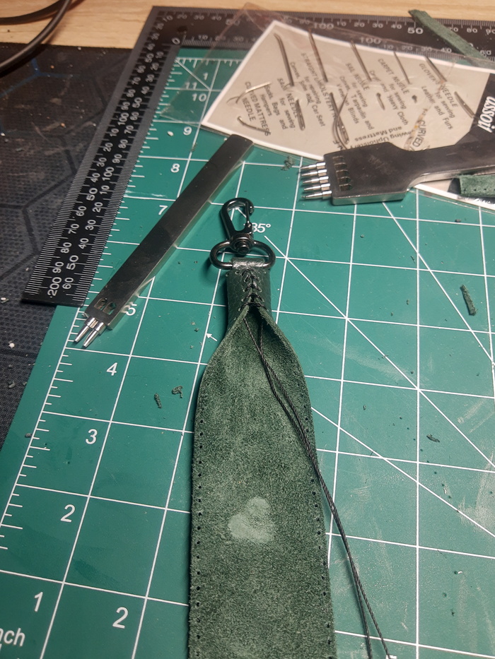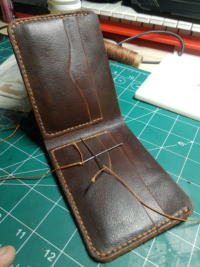 К слову из подходящих по цвету нитей была только такая. Толстая, наверное самая дешёвая, из стартового набора для работы с кожей.