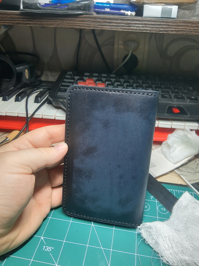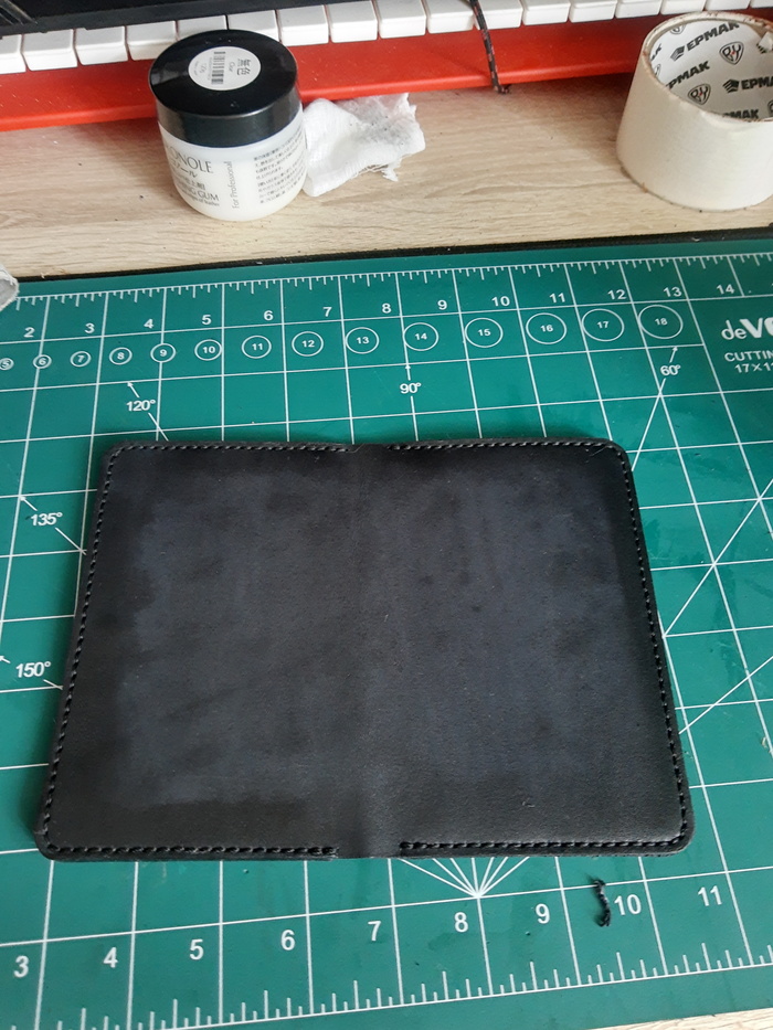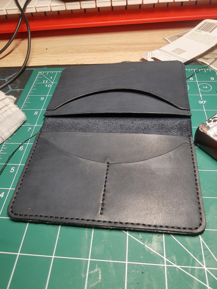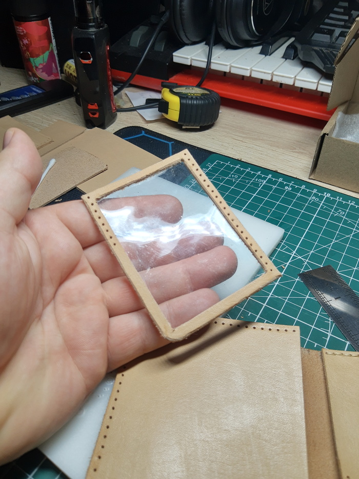 Далее стал догонять как собирать кармашки под карты. Не знаю как делают мастера со стажем, но я - новичок, запарился с ними. Точнее с позиционированием конкретно верхнего кармашка, чтобы он без зазоров стыковался с нижним и нижний лежал четко заподлицо с основной частью изделия.