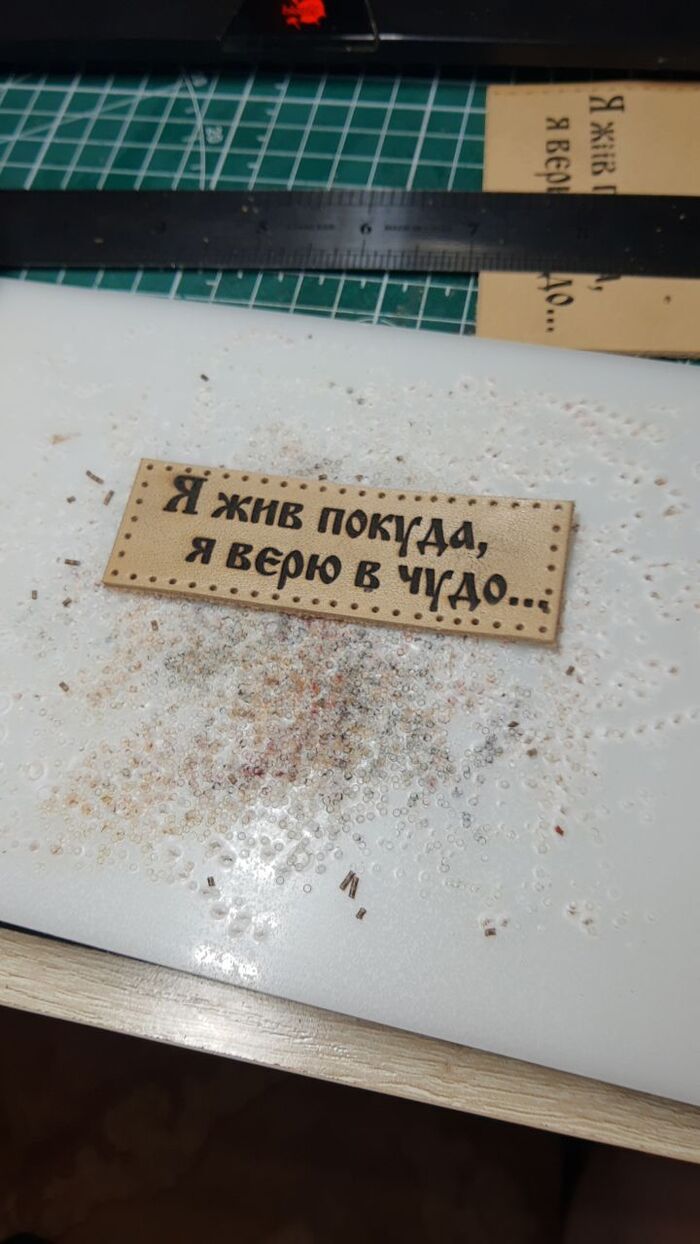 Перенести изображение оказалось не так сложно, да и прочность его в целом меня устраивает. Единственное, что я не учел, что кожа при нанесении путём нагрева, сядет. От изначального размера - 85мм, заготовка села на три мм до 82.